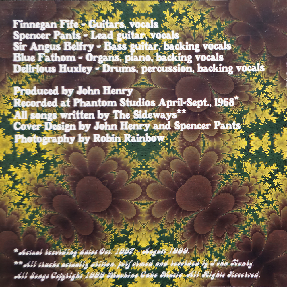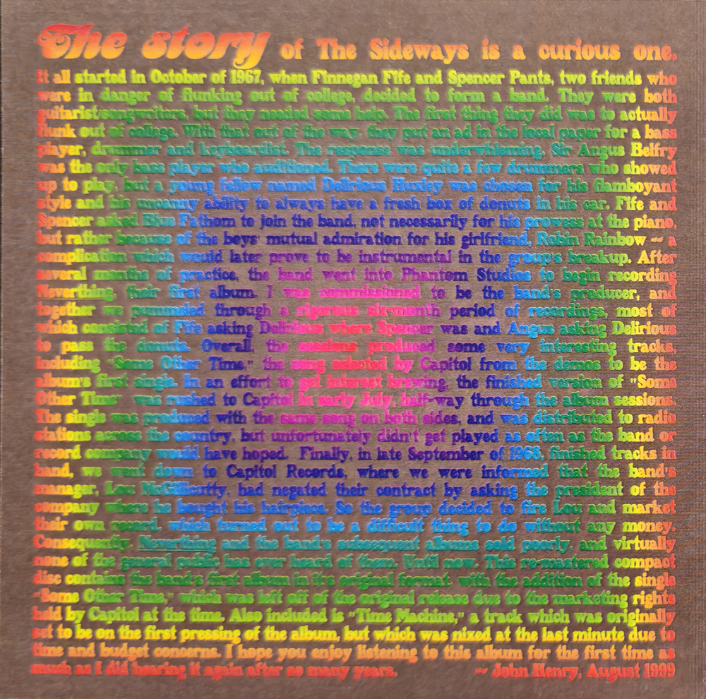 The story of The Sideways is a curious one. It all started in October of 1967, when Finnegan Fife and Spencer Pants, two friends who were in danger of flunking out of college, decided to form a band. They were both guitarist/songwriters, but they needed some help. The first thing they did was to actually flunk out of college. With that out of the way, they put an ad in the local paper for a bass player, drummer, and keyboardist. The response was underwhelming. Sir Angus Belfry was the only bass player who auditioned. There were quite a few drummers who showed up to play, but a young fellow named Delerious Huxley was chosen for his flamboyant style and his uncanny ability to always have a fresh box of donuts in his car. Fife and Spencer asked Blue Fathom to join the band, not necessarily for his prowess at the piano, but rather because of the boys' mutual admiration for his girlfriend, Robin Rainbow – a complication which would later prove to be instrumental in the group's breakup. After several months of practice, the band went to Phantom Studios to begin recording Neverthing, their first album. I was commissioned to be the band's producer, and together we pummeled through a rigorous six-month period of recordings, most of which consisted of Fife asking Delerious where Spencer was and Angus asking Delerious to pass the donuts. Overall, the sessions produced some very interesting tracks, including "Some Other Time," the song selected by Capitol from the demos to be the album's first single. In an effort to get interest brewing, the finished version of "Some Other Time" was rushed to Capitol in early July, half-way through the album sessions. The single was produced with the same song on both sides, and was distributed to radio stations across the country, but unfortunately didn't get played as often as the band or record company would have hoped. Finally, in September of 1968, finished tracks in hand, we went down to Capitol Records, where we were informed that the band's manager, Lou McGillicutty, had negated their contract by asking the president of the company where he bought his hairpiece. So, the group decided to fire Lou and market their own record, which turned out to be a difficult thing to do without any money. Consequently, Neverthing and the band's subsequent albums sold poorly, and virtually none of the general public has ever heard of them. Until now. This re-mastered compact disc contains the band's first album in it's original format, with the addition of the single "Some Other Time," which was left off the original release due to marketing rights held by Capitol at the time. Also included is "Time Machine," a track which was originally set to be on the first pressing of the album, but which was nixed at the last minute due to time and budget concerns. I hope you enjoy listening to this album for the first time as much as I did hearing again after all these many years. – John Henry, August 1999